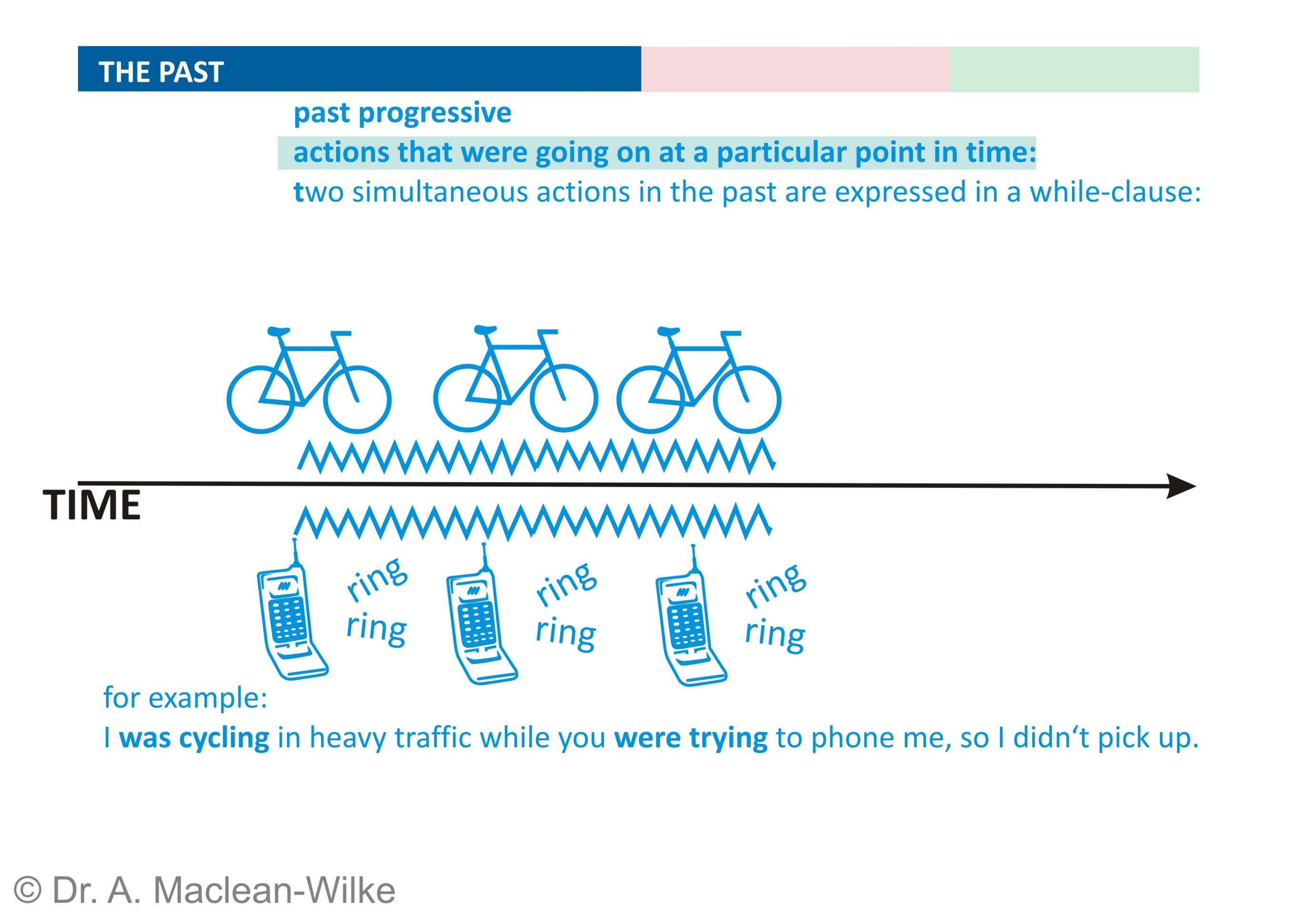 Klicken Sie auf das Bild, um eine Schritt-für-Schritt Anleitung für das Past Progressive mit Bildchen zu sehen. Einfach auf die rechte (=vorwärts) oder linke (=rückwärts) Bildhälfte tippen oder klicken, am großen Rechner oder Laptop auch per Tastatur navigieren (right-arrow: forward; left-arrow: back; esc: close).