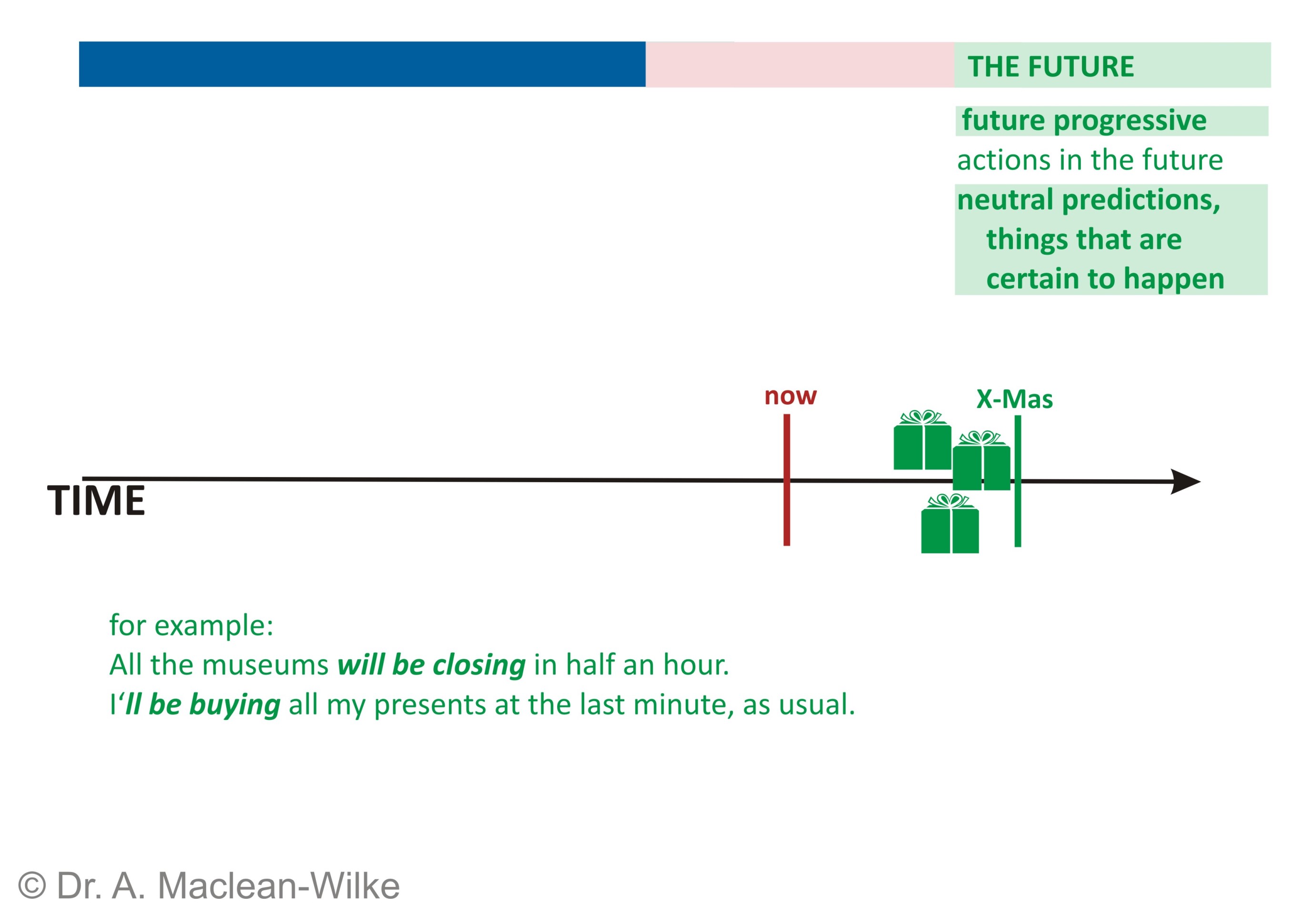 Zum anderen kann es aber auch ausdrücken, dass eine zukünftige Handlung in jedem Fall eintreten wird. Der Sprecher/Die Sprecherin legt sich damit nicht wie beim Futur ohne den Aspekt progressive darauf fest, ob er/sie eine Vermutung anstellt (will-future [Tf1]) oder ausdrückt, ganz sicher zu sein (going-to future[Tgt])